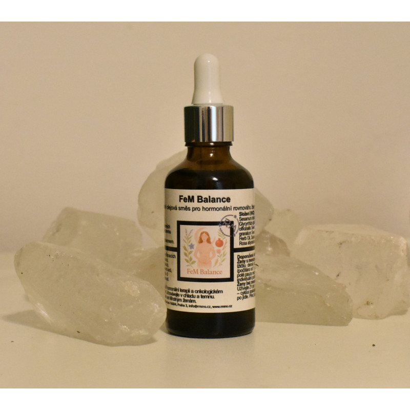 FeM Balance je terapeutická lisovaná olejová směs vytvořená speciálně pro ženy s estrogenovou dominancí, premenstruačními obtížemi, bolestí prsou, zadržováním vody nebo hormonální nerovnováhou spojenou s přebytkem estrogenu. Směs podporuje přirozené metabolické odbourávání estrogenu, zklidňuje zánět, harmonizuje psychiku a stabilizuje cyklus.
