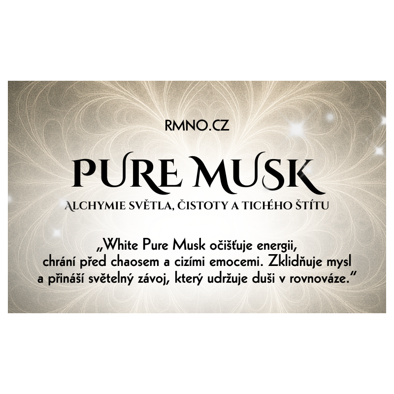 Bílý Pure Musk je jemný, éterický strážce. Voní po tichu mezi světy, kde se rodí jasné myšlenky a bezpečí.